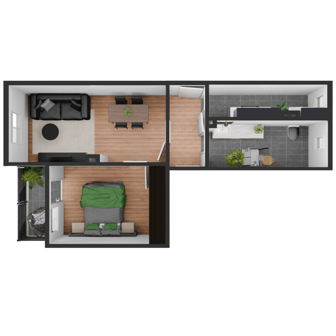 Unsere Wohnung bietet 65 Quadratmeter Wohnfläche mit zwei Zimmern. Der helle und freundliche Grundriss ermöglicht eine flexible Raumgestaltung. Große Fenster sorgen für natürliches Licht.